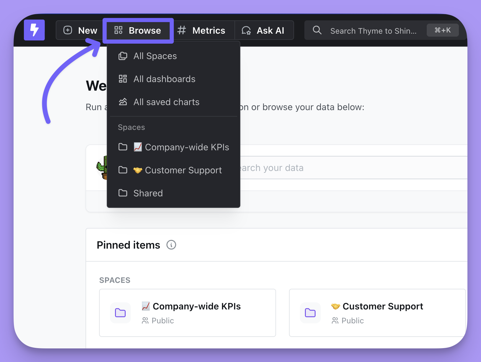 You can also browse the lists of all of the saved charts, dashboards, and Spaces that you and your teammates have made in your project by clicking on Browse in your navbar.