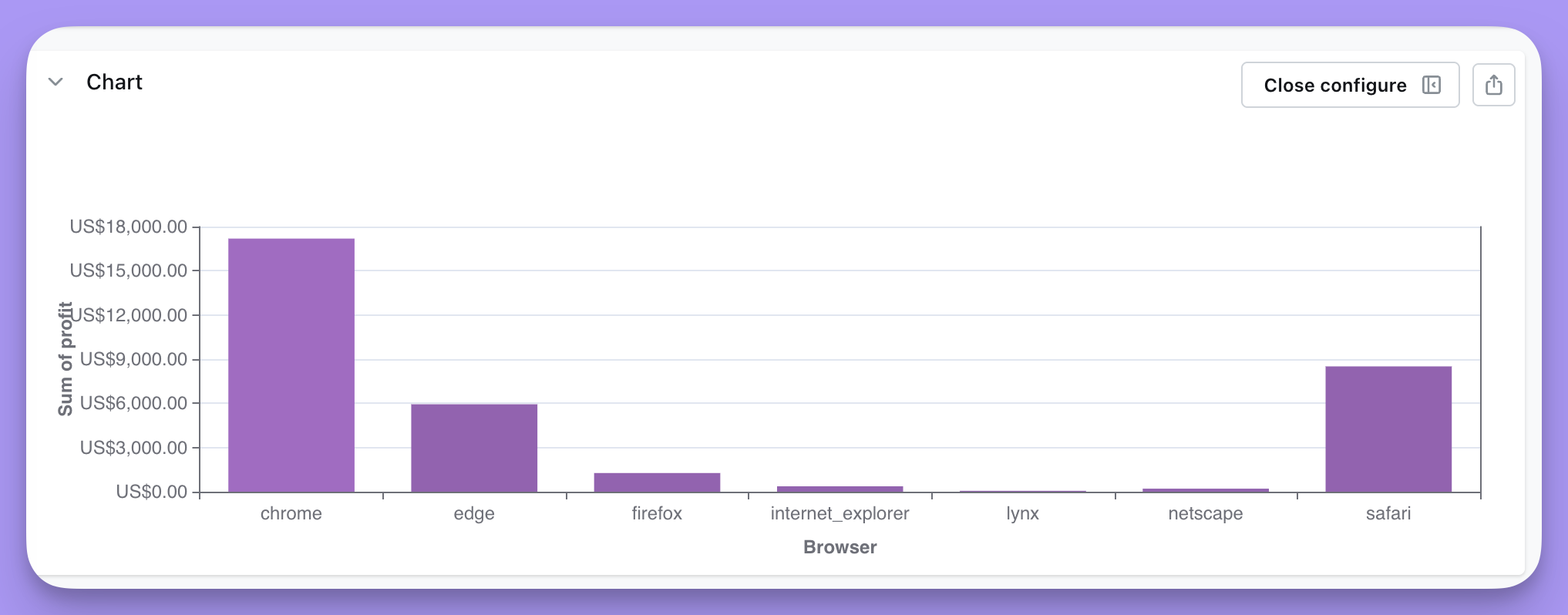 Once I’ve selected the dimension I want to group by, I click open in new tab and see a chart with my metric, grouped by Browser. Now I can uncover where this decrease in profit was coming from.