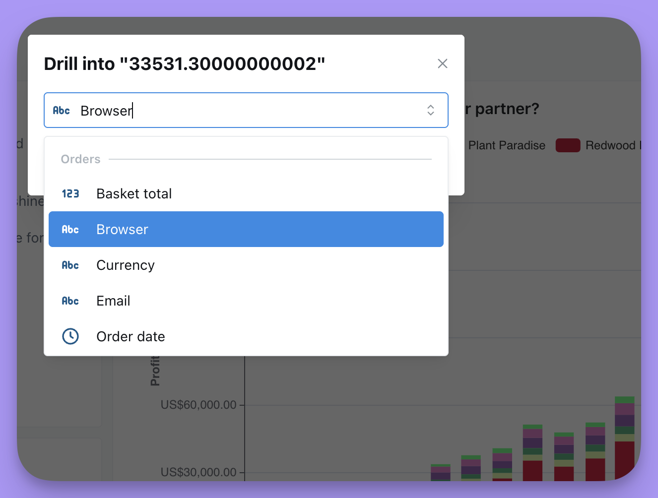 I then select the dimension I want to segment my metric by (or “drill into”). In this example, I’m interested in grouping the profit by the browser so I can figure out if there’s a decrease in traffic from different browsers.