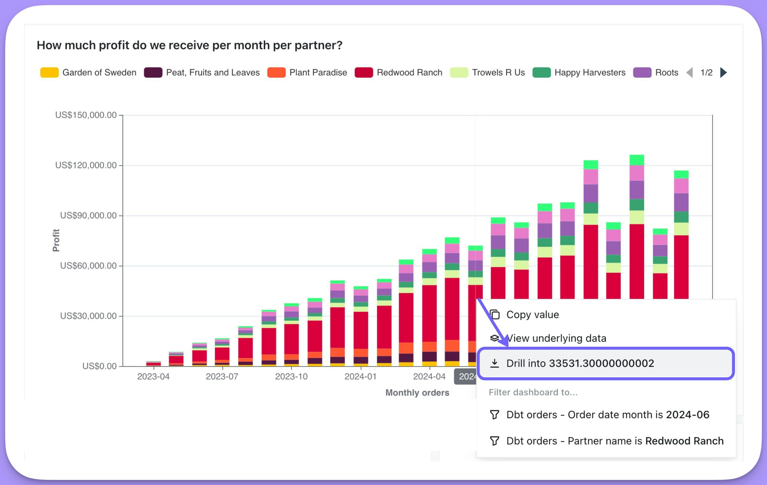 I have a chart with the total revenue per partner (a metric) over time. It looks like there was a drop in June, so I want to drill into that data point and see where the profit decrease is coming from… To do this, I click on the data point in my chart, then click drill into in the action menu: