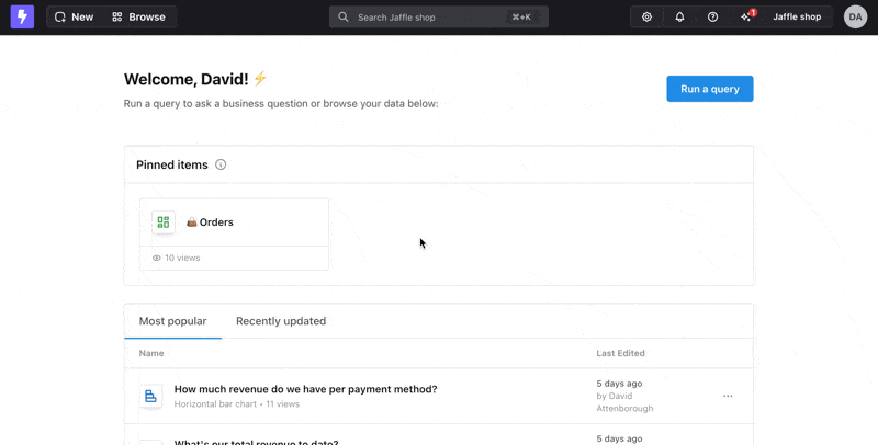 The easiest way to get started in Lightdash is to check out the saved charts and dashboards that your team’s already made. You can see a list of some of this content on your homepage as soon as you land in Lightdash.