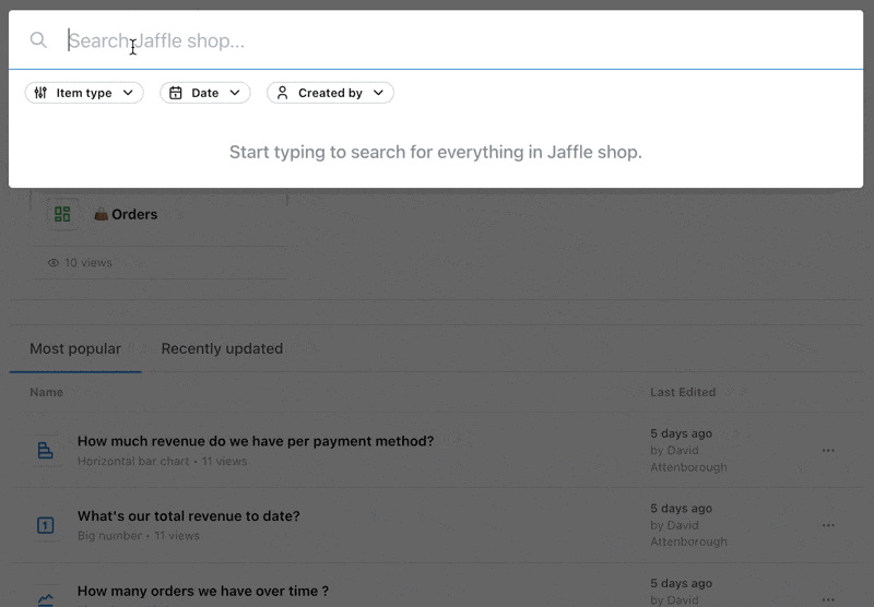 Enhance your search experience by applying filters directly in the search bar. Specify what you’re looking for by content type, and narrow down results by dates, either by choosing a range (e.g., “from: January 10, 2024, to: January 20, 2024”) or a single date (“from: January 10, 2024”). You can also filter results by the creator of the content, making it easier to find items created by specific team members.