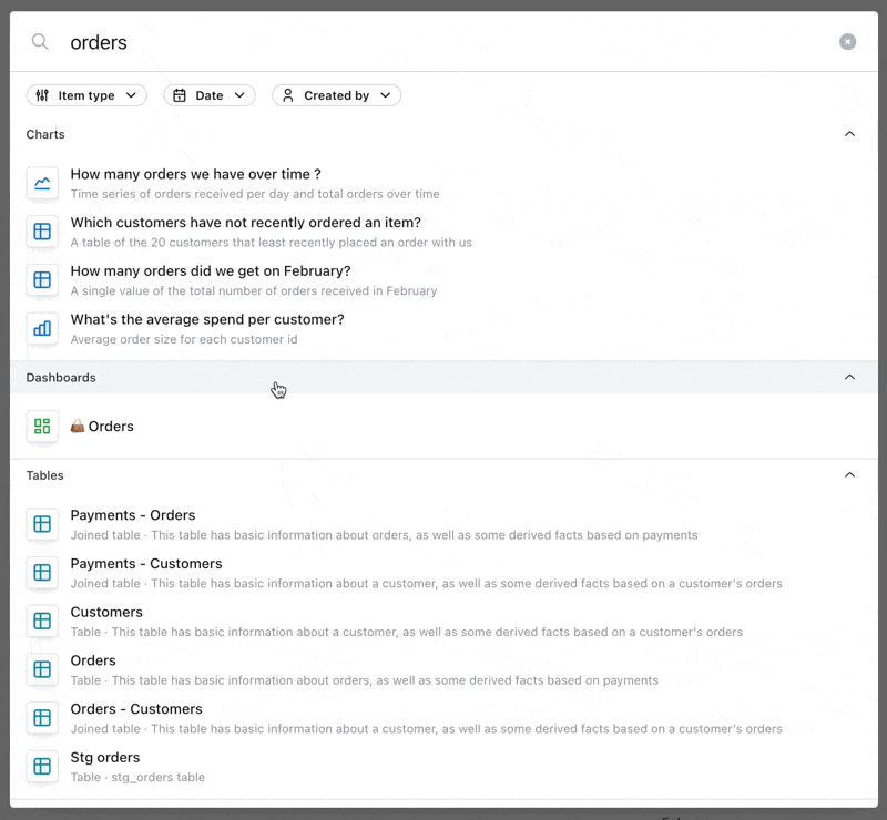 This global search feature matches content from everywhere in the project. You can search for dashboards, charts, spaces, tables, and fields by their names and descriptions. It is now more powerful, with the ability to filter results and group them for easier navigation.