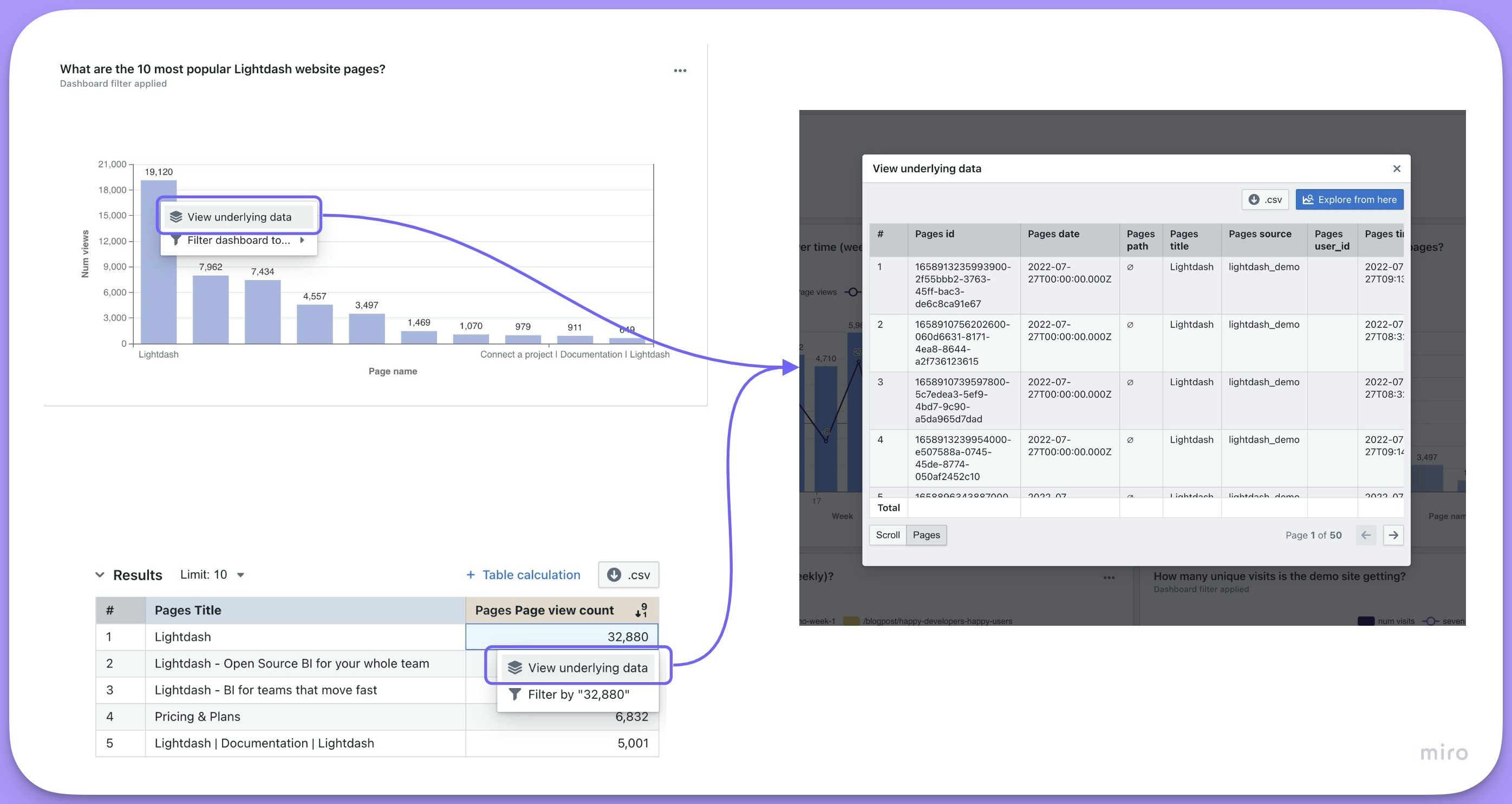 You can click on any point on a chart or any cell in a results table and view the records which make up that data point. For example, I can click on the page views bar in my chart or the value in the results table cell and I’d see all of the rows in the underlying table that make up the 19,120 page views count. I can then export this as a CSV or explore from this underlying data.