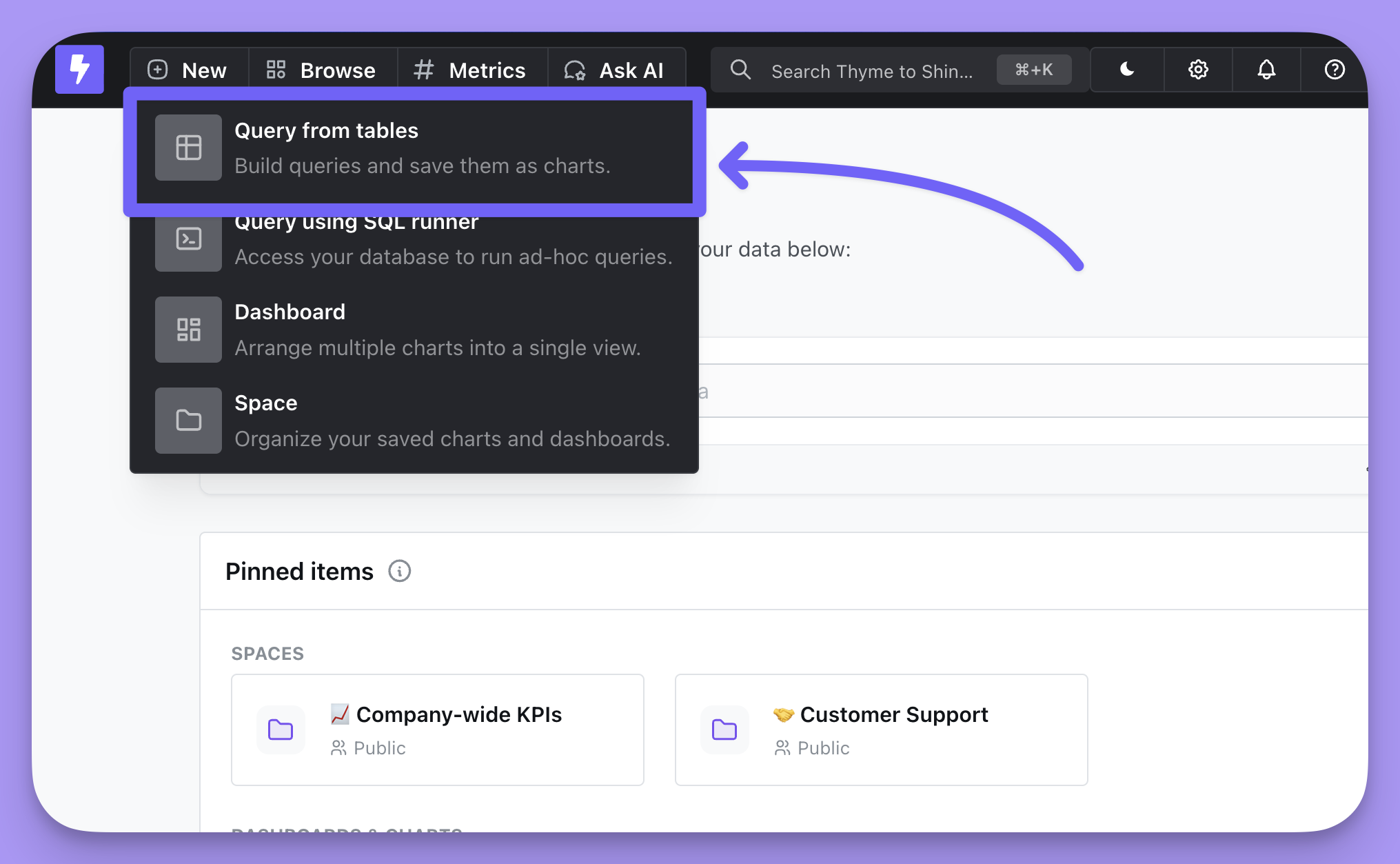 If you can’t find any relevant saved charts or dashboards that answer your question, you can build a query yourself from scratch. To start a new query, click on [+] New —> Query from tables, then select the table that you want to query from. Read more in this guide on querying from tables in Lightdash.