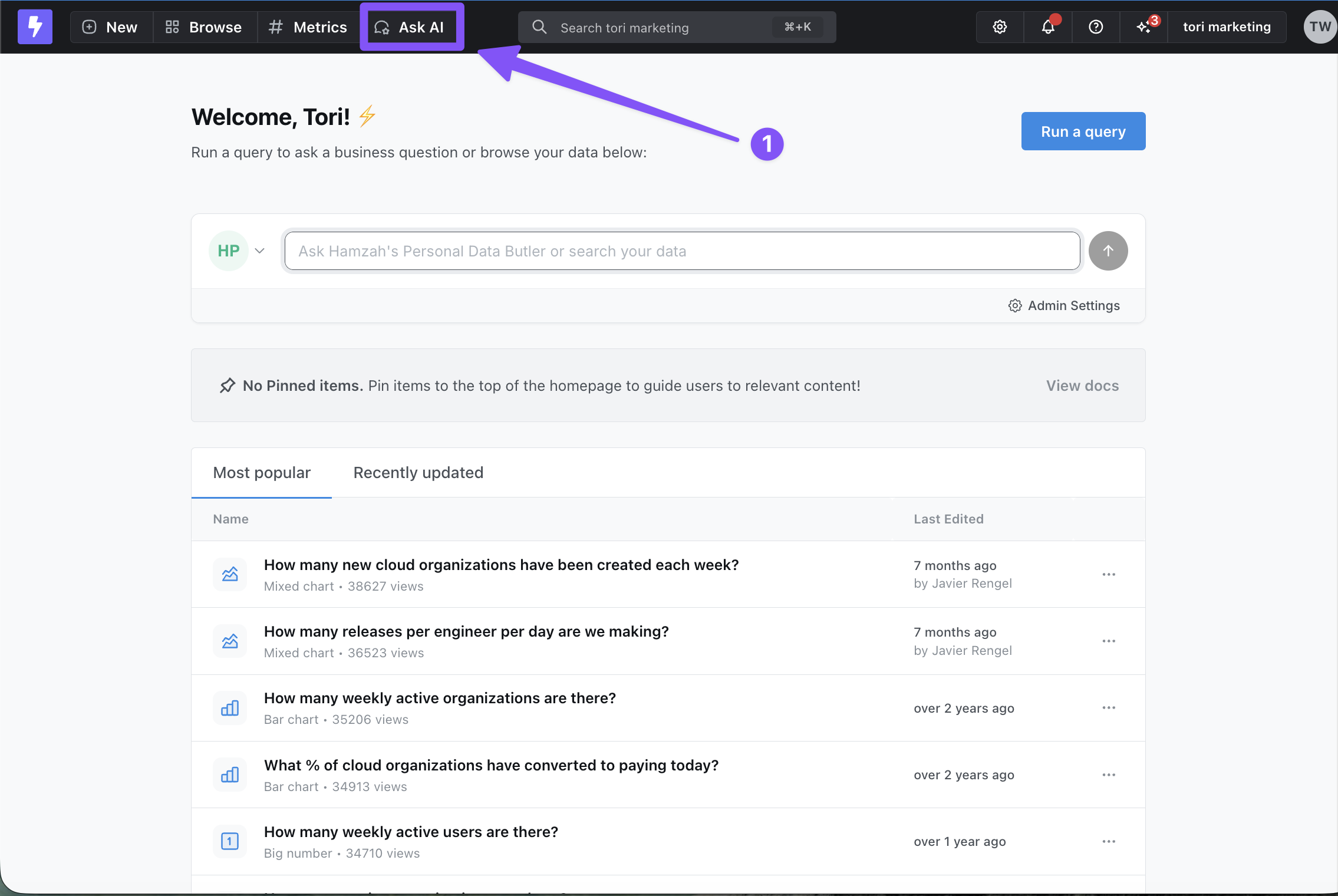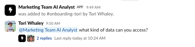 Once you’re set up - whether in the UI or in Slack - you can start asking questions immediately! Try asking “What kind of data can you access?” to get started: