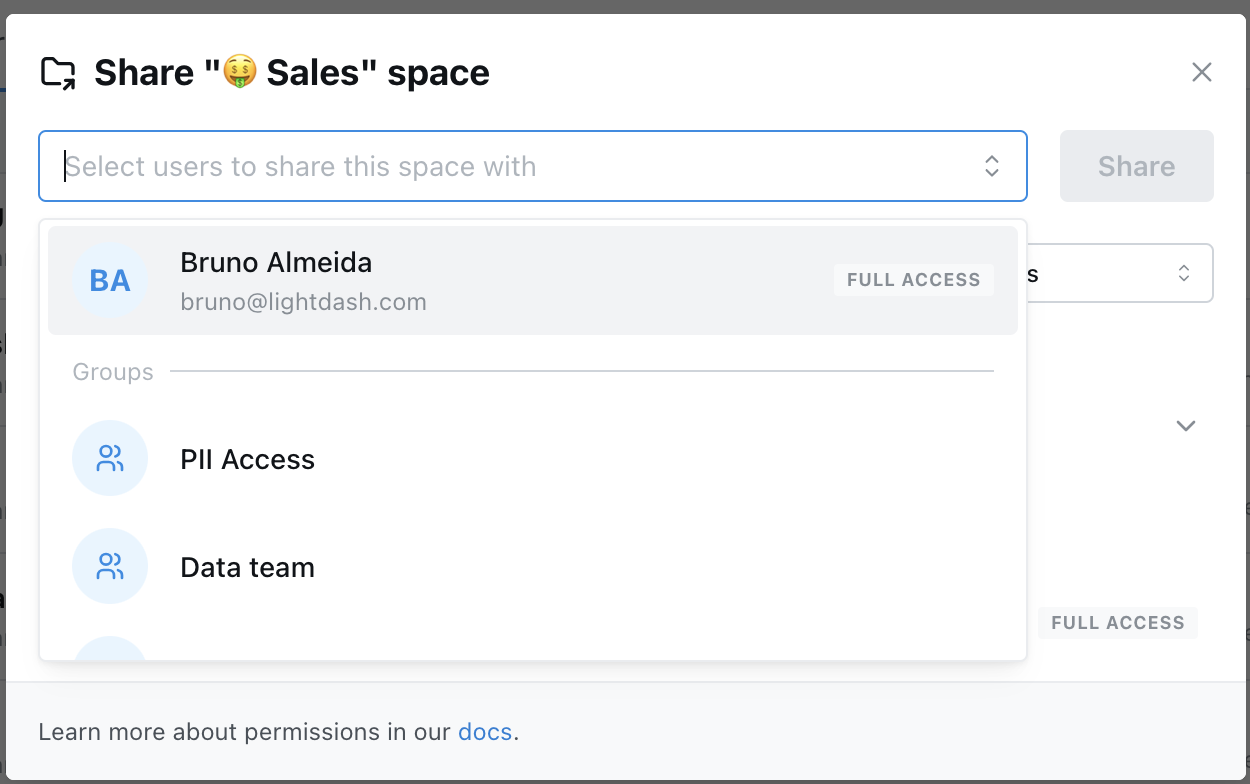 Users with Full Access to a space can restrict and increase a user’s inherited project permissions in a space (e.g. you can make project editors into can view in a space). Space permissions determine which users can edit space contents (charts and dashboards), view the contents in a space, and change a space’s settings: